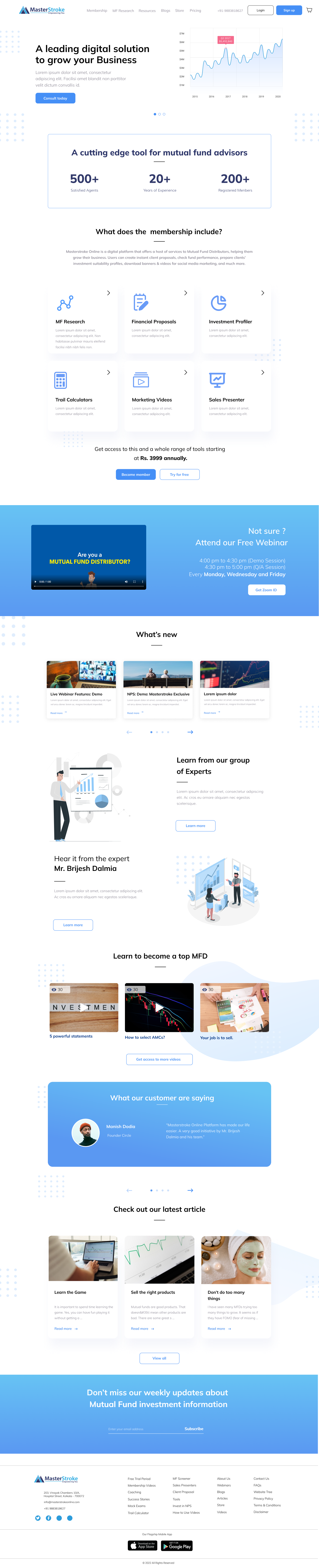Masterstroke Online is a digital platform that offers a host of services to Mutual Fund Distributors, helping them grow their business. Users can create instant client proposals, Do Mutual Fund Research, check fund performance, prepare clients' investment suitability profiles, download banners & videos for social media marketing, and much more.
